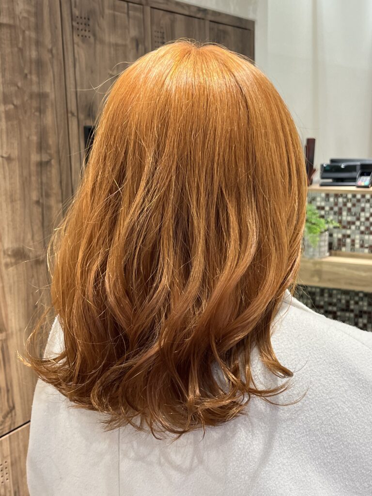 今回の方はブリーチをしたことがなく暗いお色だったのですが、オレンジカラーはそこからブリーチ一回でもこれほど綺麗に発色します!