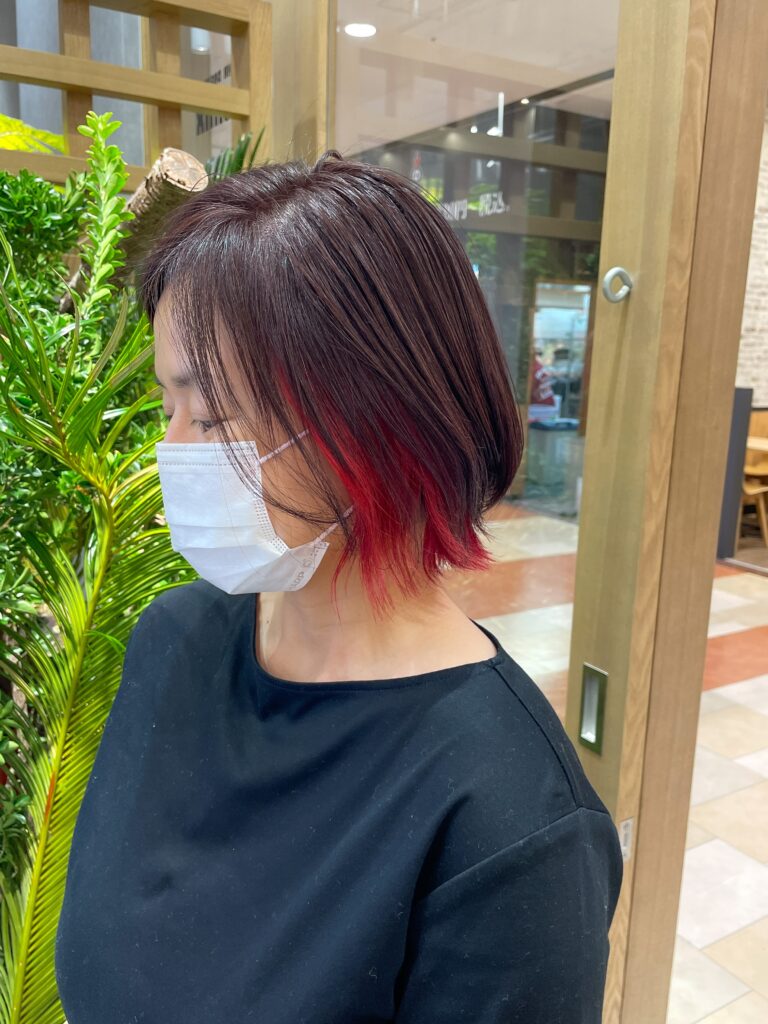 カウンセリングしていく中でインナーカラーをしてみたいと。赤とか憧れとの事なのでさせて頂きました。